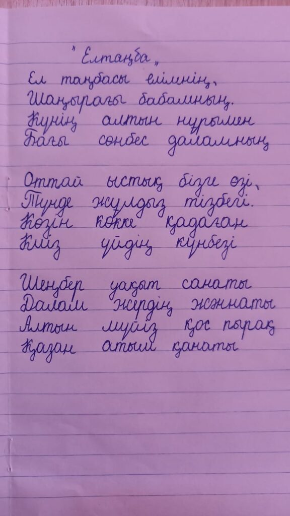 Әшірбай Айзере Әлішерқызы. Көркем жазу Түркістан облысы, Ордабасы ауданы,Қайнар ауылы,Дулат негізгі орта мектебі Сынып жетекшісі Тасполат Жазира Ниязбекқызы Поделиться FacebookTwitterPinterestWhatsApp Басқа қатысушылар «АЛТЫН ҚАЗЫНА» КӨРКЕМ ЖӘНЕ СӘНДІК-ҚОЛДАНБАЛЫ ӨНЕР КОНКУРСЫ Байқауға қатысушы: Тойбазарова Мөлдір Ержанқызы 0 «ҮЗДІК АВТОРЛЫҚ БАҒДАРЛАМА» БАЙҚАУЫ Еспембетова Раушан Жалеловна 0 «ҮЗДІК АВТОРЛЫҚ БАҒДАРЛАМА» БАЙҚАУЫ Шикунова Юлия Анатольевна 0 «ҮЗДІК АВТОРЛЫҚ БАҒДАРЛАМА» БАЙҚАУЫ Кадирова Салтанат Сатышовна 0 «ҮЗДІК АВТОРЛЫҚ БАҒДАРЛАМА» БАЙҚАУЫ Атаханова Жанагул Жусиповна 0