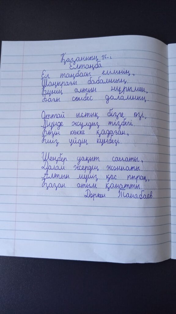 Өмірбек Айлана Дәулетқызы. Көркем жазу Өмірбек Айлана Дәулетқызы 50 мектеп Қазғарыш лецей 3-г сынып оқушысы Жетекшісі Ерлан Мадина Поделиться FacebookTwitterPinterestWhatsApp Басқа қатысушылар «АЛТЫН ҚАЗЫНА» КӨРКЕМ ЖӘНЕ СӘНДІК-ҚОЛДАНБАЛЫ ӨНЕР КОНКУРСЫ Байқауға қатысушы: Тойбазарова Мөлдір Ержанқызы 0 «ҮЗДІК АВТОРЛЫҚ БАҒДАРЛАМА» БАЙҚАУЫ Еспембетова Раушан Жалеловна 0 «ҮЗДІК АВТОРЛЫҚ БАҒДАРЛАМА» БАЙҚАУЫ Шикунова Юлия Анатольевна 0 «ҮЗДІК АВТОРЛЫҚ БАҒДАРЛАМА» БАЙҚАУЫ Кадирова Салтанат Сатышовна 0 «ҮЗДІК АВТОРЛЫҚ БАҒДАРЛАМА» БАЙҚАУЫ Атаханова Жанагул Жусиповна 0