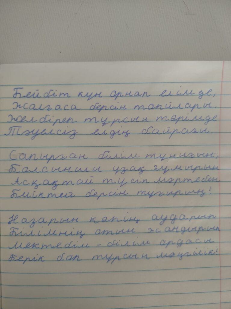 Бейсен Айша. Көркем жазу Жамбыл жалпы білім беретін мектебі 2 б сынып оқушысы Бейсен Айша Сынып жетекшісі Какенова Алмагуль Сайлауовна Поделиться FacebookTwitterPinterestWhatsApp Басқа қатысушылар 2-сынып оқушылары арасында өткен Республикалық «көркем жазу» байқауы Темирбеков Нуржан Серикович. Көркем жазу 0 2-сынып оқушылары арасында өткен Республикалық «көркем жазу» байқауы Сатбалдин Құрмет Ералыұлы. Көркем жазу 0 2-сынып оқушылары арасында өткен Республикалық «көркем жазу» байқауы Бақытжан Бауыржан Жұмабекұлы. Көркем жазу 0 2-сынып оқушылары арасында өткен Республикалық «көркем жазу» байқауы Габдолнуров Нурали Жандосович. Көркем жазу 0 2-сынып оқушылары арасында өткен Республикалық «көркем жазу» байқауы Танат Айханым Мұратбекқызы. Көркем жазу 0