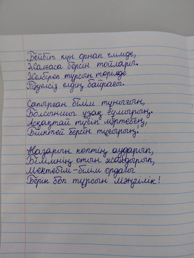 Көркем жазу. Әбдібек Жания Жамбыл облысы Тараз қаласы №32 орта мектеп 3 "А" сынып оқушысы Әбдібек Жания Бақытжанқызы Жетекшісі: Нұрбек Мөлдір Жексенбекқызы Поделиться FacebookTwitterPinterestWhatsApp Басқа қатысушылар Даярлық сыныптары мен 1-сынып оқушылары арасында өткен Республикалық «көркем жазу» байқауы Көркем жазу. Хасанова Гүлназ 0 Даярлық сыныптары мен 1-сынып оқушылары арасында өткен Республикалық «көркем жазу» байқауы Көркем жазу. Багдад Кеменгер 0 Даярлық сыныптары мен 1-сынып оқушылары арасында өткен Республикалық «көркем жазу» байқауы Көркем жазу. Шаяхмет Әдемі 0 Даярлық сыныптары мен 1-сынып оқушылары арасында өткен Республикалық «көркем жазу» байқауы Көркем жазу. Абдреш Айзере 0 Даярлық сыныптары мен 1-сынып оқушылары арасында өткен Республикалық «көркем жазу» байқауы Көркем жазу. Арын Абдулла 0