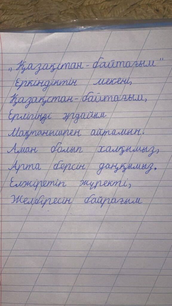 Көркем жазу. Дәулетбай Муслим Алматы облысы Қарасай ауданы Шалқар ауылы "Шалқар орта мектебі" КММ-нің 1 "В"сынып оқушысы Дәулетбай Муслим Сынып жетекшісі Нурбакова Нурия Уракбаевна Поделиться FacebookTwitterPinterestWhatsApp Басқа қатысушылар «ҮЗДІК АВТОРЛЫҚ БАҒДАРЛАМА» БАЙҚАУЫ Махамбетова Асемгул Махамбетовна 0 «АЛТЫН ҚАЗЫНА» КӨРКЕМ ЖӘНЕ СӘНДІК-ҚОЛДАНБАЛЫ ӨНЕР КОНКУРСЫ Байқауға қатысушы: Маммадинов Тимур 0 2-сынып оқушылары арасында өткен Республикалық «көркем жазу» байқауы Амандық Муслим. Көркем жазу 0 2-сынып оқушылары арасында өткен Республикалық «көркем жазу» байқауы Қуанышбай Ару. Көркем жазу 0 2-сынып оқушылары арасында өткен Республикалық «көркем жазу» байқауы АМАНДЫҚ МУСЛИМ БОЛЫСҰЛЫ. Көркем жазу 0