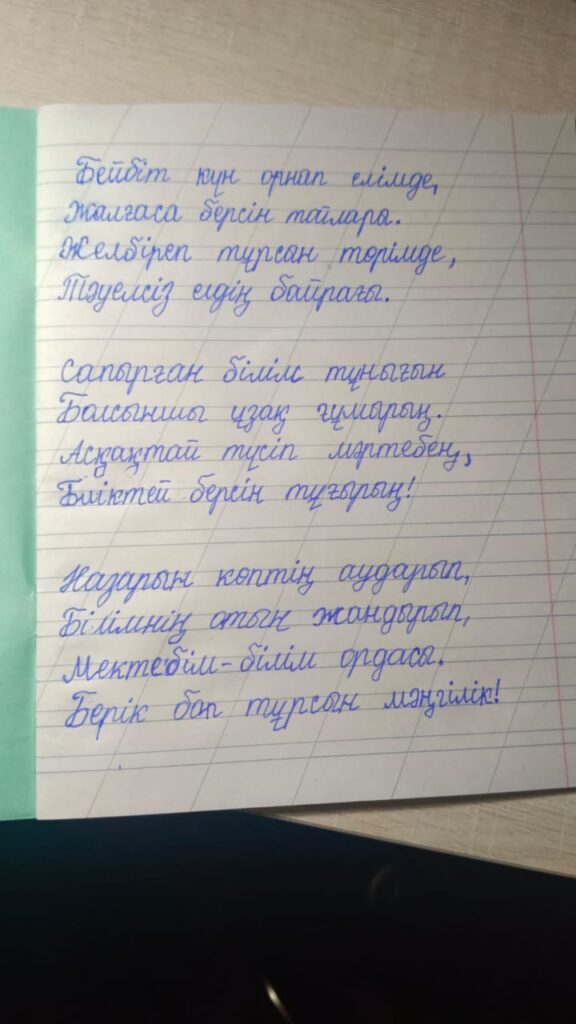 Көркем жазу. Махамбетова Амина Абай атындағы мектеп -лицей 3 б сынып оқушысы Махамбетова Амина Жолдасбековна Жетекшісі -Айтбаева Күлайша Қалдыбайқызы Поделиться FacebookTwitterPinterestWhatsApp Басқа қатысушылар Даярлық сыныптары мен 1-сынып оқушылары арасында өткен Республикалық «көркем жазу» байқауы Көркем жазу. Хасанова Гүлназ 0 Даярлық сыныптары мен 1-сынып оқушылары арасында өткен Республикалық «көркем жазу» байқауы Көркем жазу. Багдад Кеменгер 0 Даярлық сыныптары мен 1-сынып оқушылары арасында өткен Республикалық «көркем жазу» байқауы Көркем жазу. Шаяхмет Әдемі 0 Даярлық сыныптары мен 1-сынып оқушылары арасында өткен Республикалық «көркем жазу» байқауы Көркем жазу. Абдреш Айзере 0 Даярлық сыныптары мен 1-сынып оқушылары арасында өткен Республикалық «көркем жазу» байқауы Көркем жазу. Арын Абдулла 0