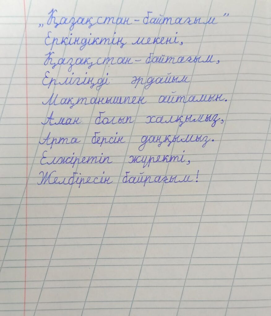 Көркем жазу. Нұралхан Назерке Алматы облысы,Қарасай ауданы,Шалқар ауылы "Шалқар орта мектебі"КММ-нің 1"Г"сынып оқушысы. Жетекшісі: Оспанова Алмагуль Баурбековна Поделиться FacebookTwitterPinterestWhatsApp Басқа қатысушылар «ҮЗДІК АВТОРЛЫҚ БАҒДАРЛАМА» БАЙҚАУЫ Махамбетова Асемгул Махамбетовна 0 «АЛТЫН ҚАЗЫНА» КӨРКЕМ ЖӘНЕ СӘНДІК-ҚОЛДАНБАЛЫ ӨНЕР КОНКУРСЫ Байқауға қатысушы: Маммадинов Тимур 0 2-сынып оқушылары арасында өткен Республикалық «көркем жазу» байқауы Амандық Муслим. Көркем жазу 0 2-сынып оқушылары арасында өткен Республикалық «көркем жазу» байқауы Қуанышбай Ару. Көркем жазу 0 2-сынып оқушылары арасында өткен Республикалық «көркем жазу» байқауы АМАНДЫҚ МУСЛИМ БОЛЫСҰЛЫ. Көркем жазу 0