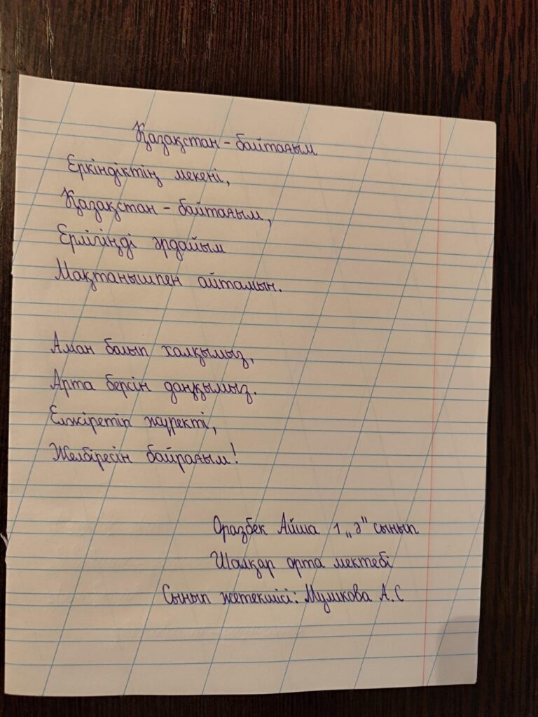 Көркем жазу. Оразбек Айша Сынып жетекшісі: Муликова Айнур Сайлаубековна Поделиться FacebookTwitterPinterestWhatsApp Басқа қатысушылар «ҮЗДІК АВТОРЛЫҚ БАҒДАРЛАМА» БАЙҚАУЫ Махамбетова Асемгул Махамбетовна 0 «АЛТЫН ҚАЗЫНА» КӨРКЕМ ЖӘНЕ СӘНДІК-ҚОЛДАНБАЛЫ ӨНЕР КОНКУРСЫ Байқауға қатысушы: Маммадинов Тимур 0 2-сынып оқушылары арасында өткен Республикалық «көркем жазу» байқауы Амандық Муслим. Көркем жазу 0 2-сынып оқушылары арасында өткен Республикалық «көркем жазу» байқауы Қуанышбай Ару. Көркем жазу 0 2-сынып оқушылары арасында өткен Республикалық «көркем жазу» байқауы АМАНДЫҚ МУСЛИМ БОЛЫСҰЛЫ. Көркем жазу 0