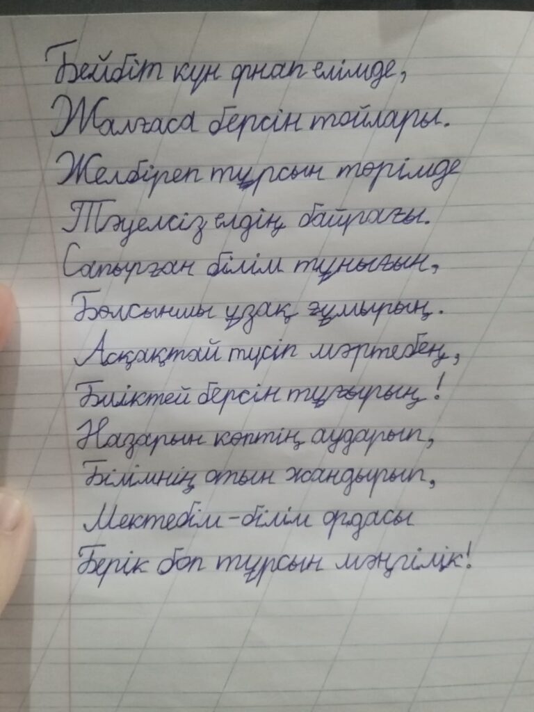 Маман Махмуд Асқарұлы. Көркем жазу Маман Махмуд Асқарұлы Мектептің атауы Children Caspian 2 А сынып Мангыстау облысы Мунайлы ауданы село Атамекен Поделиться FacebookTwitterPinterestWhatsApp Басқа қатысушылар Директор Тәжен Айбар Полатұлы. Көркем жазу 0 2-сынып оқушылары арасында өткен Республикалық «көркем жазу» байқауы Аманқос Ақмаржан Оспанқызы. Көркем жазу 0 2-сынып оқушылары арасында өткен Республикалық «көркем жазу» байқауы Алмасұлы Исламхан. Көркем жазу 0 «ҮЗДІК АВТОРЛЫҚ БАҒДАРЛАМА» БАЙҚАУЫ Самбетова Айжаркын Тулегеновна 0 «ҮЗДІК АВТОРЛЫҚ БАҒДАРЛАМА» БАЙҚАУЫ Шарапова Алия 0