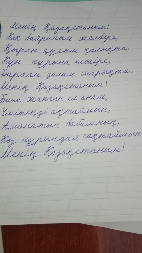 Мажитова Муштарибану Латифовна. Көркем жазу Түркістан облысы Жетісай ауданы Р.Қошқарбаев атындағы 50 жалпы білім беретін мектеп кмм 2ә сынып оқушысы Мажитова Муштарибану Латифовна Сынып жетекшісі Тузелова Жанат Жамалбековна Поделиться FacebookTwitterPinterestWhatsApp Басқа қатысушылар «ҮЗДІК АВТОРЛЫҚ БАҒДАРЛАМА» БАЙҚАУЫ Сейтова Назым Амирбековна 0 «ҮЗДІК АВТОРЛЫҚ БАҒДАРЛАМА» БАЙҚАУЫ Гайдайчук Юлия Александровна 0 «ҮЗДІК АВТОРЛЫҚ БАҒДАРЛАМА» БАЙҚАУЫ Тасылбаева Динара Казезовна 0 «АЛТЫН ҚАЗЫНА» КӨРКЕМ ЖӘНЕ СӘНДІК-ҚОЛДАНБАЛЫ ӨНЕР КОНКУРСЫ Байқауға қатысушы: Темирболатова Амели 0 «ҮЗДІК АВТОРЛЫҚ БАҒДАРЛАМА» БАЙҚАУЫ Кузьмина Мария Владимировна 0