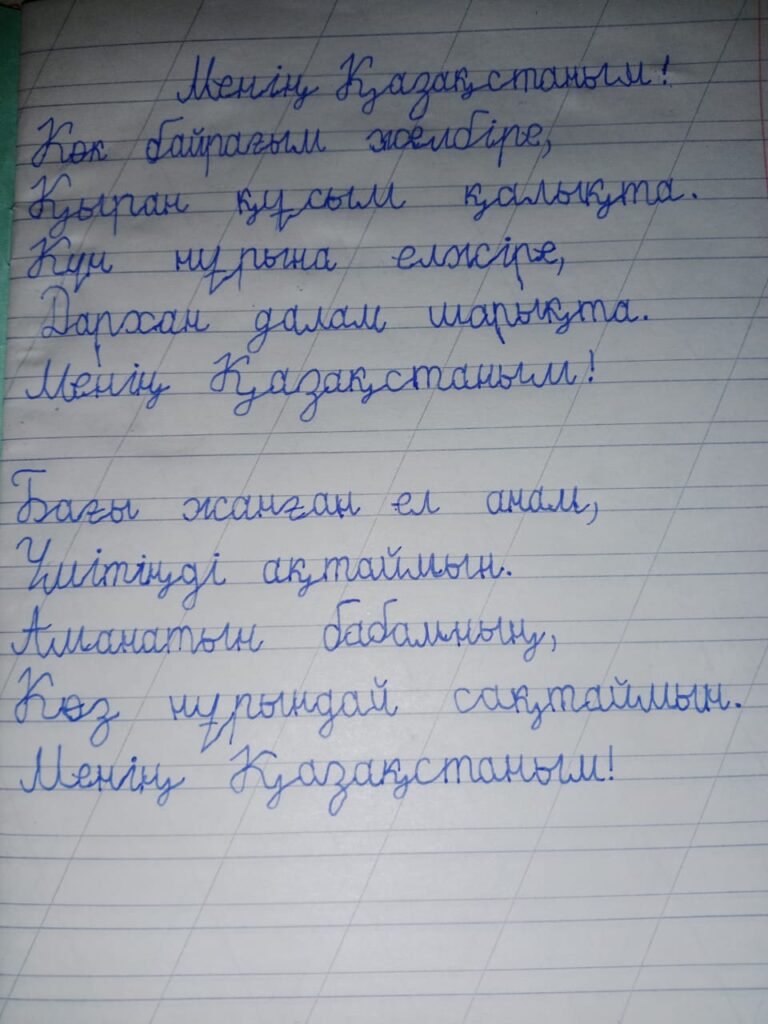 Нұрхан Нурланұлы. Көркем жазу Абай облысы Мақаншы ауданы "Көктал орта мектеп-бақшасы" КММ 1 сынып оқушысы Серікқан Нұрхан Нурланұлы Поделиться FacebookTwitterPinterestWhatsApp Басқа қатысушылар «ҮЗДІК АВТОРЛЫҚ БАҒДАРЛАМА» БАЙҚАУЫ Сейтова Назым Амирбековна 0 «ҮЗДІК АВТОРЛЫҚ БАҒДАРЛАМА» БАЙҚАУЫ Гайдайчук Юлия Александровна 0 «ҮЗДІК АВТОРЛЫҚ БАҒДАРЛАМА» БАЙҚАУЫ Тасылбаева Динара Казезовна 0 «АЛТЫН ҚАЗЫНА» КӨРКЕМ ЖӘНЕ СӘНДІК-ҚОЛДАНБАЛЫ ӨНЕР КОНКУРСЫ Байқауға қатысушы: Темирболатова Амели 0 «ҮЗДІК АВТОРЛЫҚ БАҒДАРЛАМА» БАЙҚАУЫ Кузьмина Мария Владимировна 0
