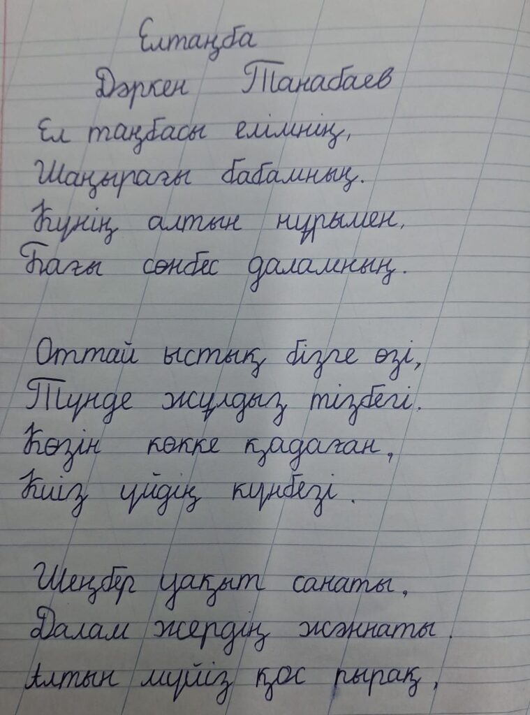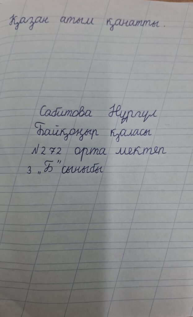 Сабитова Нургул Едиловна. Көркем жазу Байқоныр қаласы 272-орта мектеп 3 "Б" Сынып жетекшісі Нуржанова Баян Казибаевна Поделиться FacebookTwitterPinterestWhatsApp Басқа қатысушылар «АЛТЫН ҚАЗЫНА» КӨРКЕМ ЖӘНЕ СӘНДІК-ҚОЛДАНБАЛЫ ӨНЕР КОНКУРСЫ Байқауға қатысушы: Тойбазарова Мөлдір Ержанқызы 0 «ҮЗДІК АВТОРЛЫҚ БАҒДАРЛАМА» БАЙҚАУЫ Еспембетова Раушан Жалеловна 0 «ҮЗДІК АВТОРЛЫҚ БАҒДАРЛАМА» БАЙҚАУЫ Шикунова Юлия Анатольевна 0 «ҮЗДІК АВТОРЛЫҚ БАҒДАРЛАМА» БАЙҚАУЫ Кадирова Салтанат Сатышовна 0 «ҮЗДІК АВТОРЛЫҚ БАҒДАРЛАМА» БАЙҚАУЫ Атаханова Жанагул Жусиповна 0